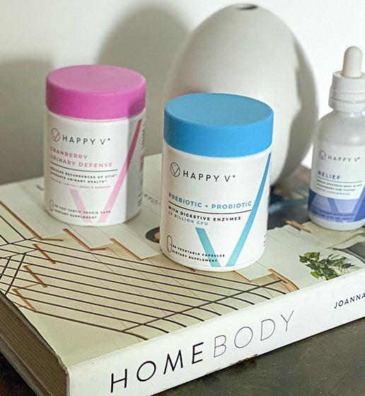 Our Happy V® Prebiotic + Probiotic designed to support vaginal health and balance. Eliminate the odor, itch, gut bloating, and other symptoms.