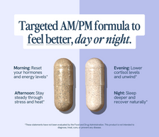 Our day/night dual-action formula is designed to match your body’s hormonal fluctuations throughout the day. It includes science-backed ingredients like DIM, Genistein, BroccoRaphanin®, HMRlignan™, Graminex®, and Sensoril® Ashwagandha, plus targeted vitamins and minerals for 24-hour relief.