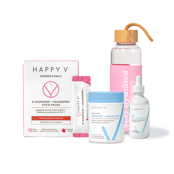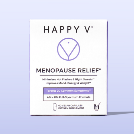 Happy V® Menopause Relief formula focuses on balancing estrogen, curbing unwanted weight gain, reducing hot flashes and night sweats. It also improves energy levels and your overall mood!