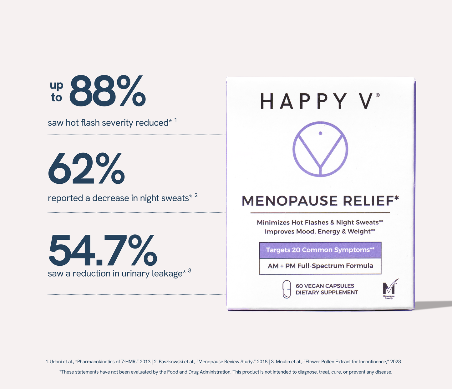 How does Happy V®’s Menopause Relief help with hot flashes and night sweats?