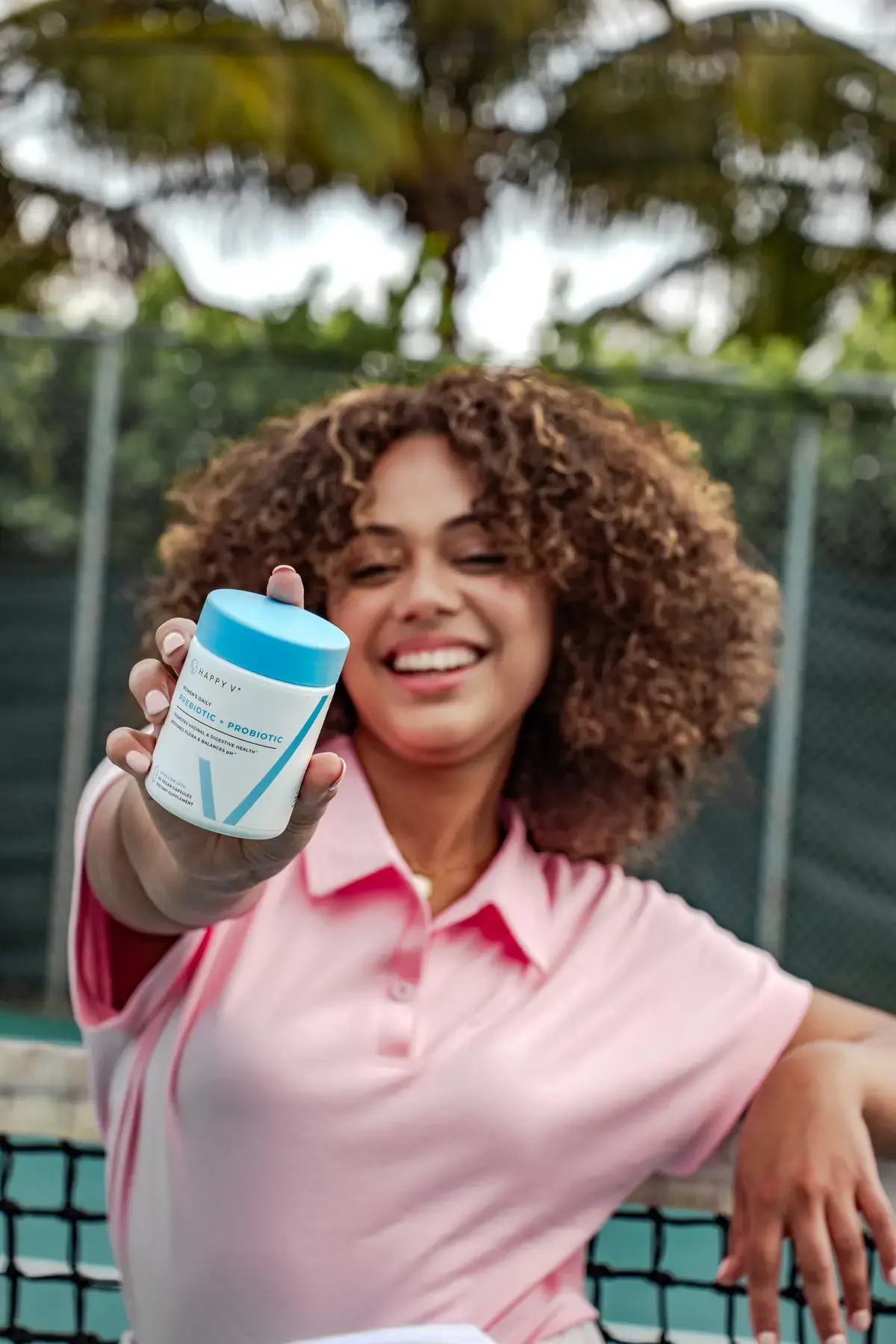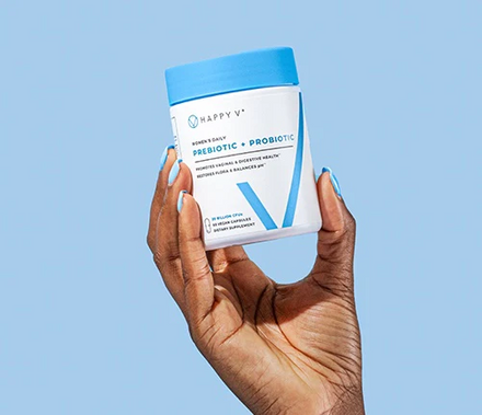 Our Happy V® Prebiotic + Probiotic designed to support vaginal health and balance. Eliminate the odor, itch, gut bloating, and other symptoms.